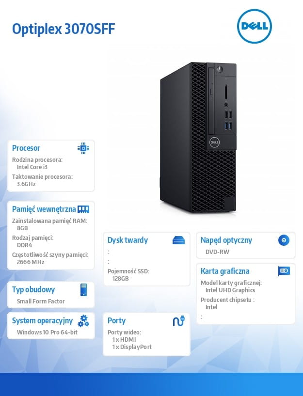 | Pełna nazwa | Dell Komputer Dell Optiplex 3070 SFF W10Pro i3-9100/8GB/128GB SSD/Intel UHD 630/DVD RW/KB216 & MS116/3Y BWOS |