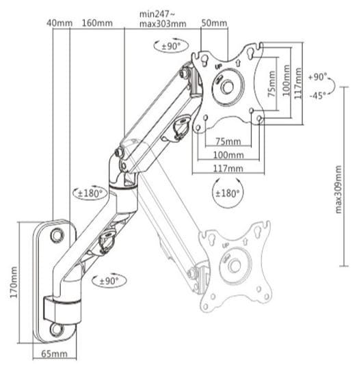 - Ramię obraca się, rozciąga i chowa, pochyla się, aby zmienić kąty widzenia, i pozwala obracać wyświetlacz z trybu poziomego do pionowego itp.
